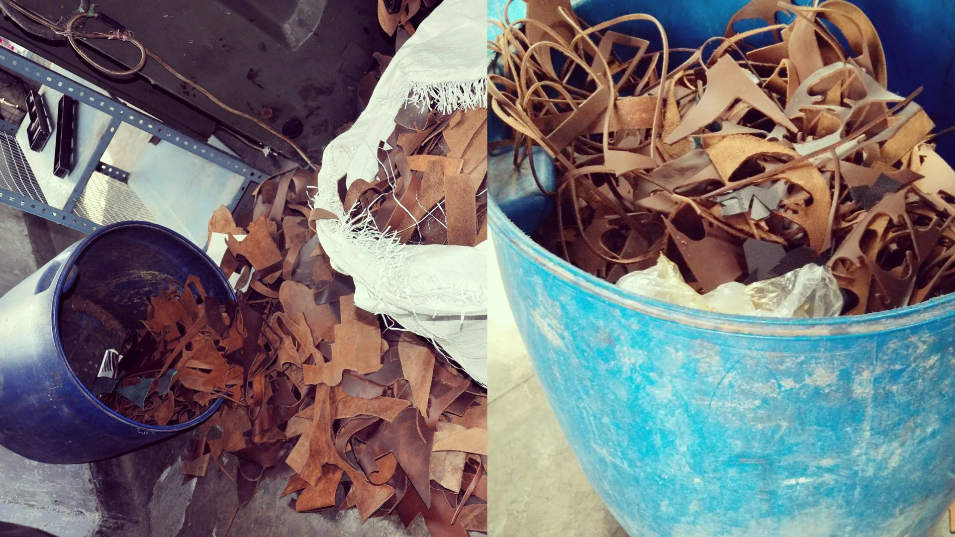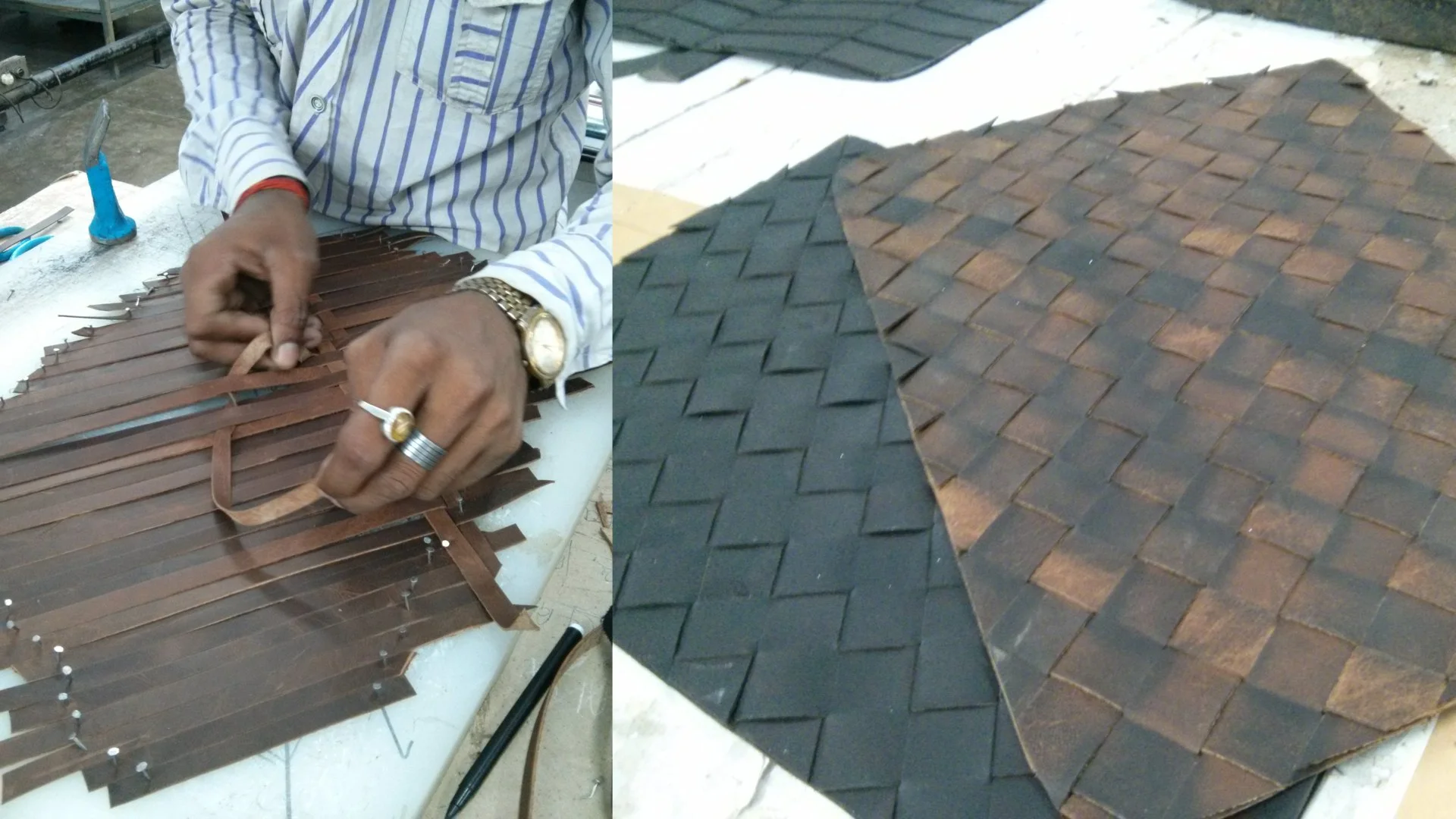 (BETTER)’ was prototyped with Prachi Leathers, a leather factory and tannery located in Kanpur, India. A visualization of the existing system at Prachi helped to identify a story that producers would want to hide and (BETTER)’ transformed it into one that they would want to tell. Identifying leather scraps, which result from the factory’s everyday production and usually end up in landfill, as a story that they would want to hide served as a fitting opportunity to prototype an initial small change. Working with the factory’s sample team, (BETTER)’ brainstormed ways in which the scraps could be put to use. Because of their skill and leather craftsmanship, the sample team turned out to be an asset in this experiment. Through several experiments with the sample team, (BETTER)’ and Prachi created a line of upcycled leather goods by stitching and weaving together the leather remnants. Worker voices told the story of Prachi and their process of creating a better product from waste material. Collaborating with her colleague Cassandra Michel, Gupta branded the experiment as TRMTAB.