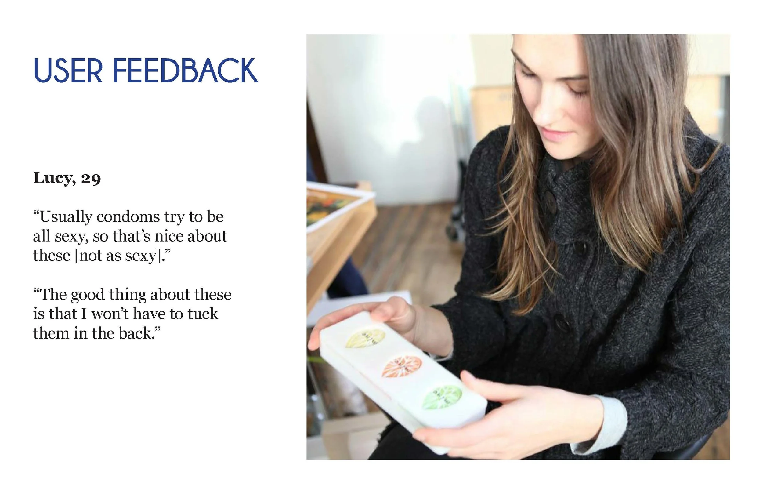 We chose to target condom packaging, which is either typically generic or overtly targeted toward men, to create a less embarrassing purchasing experience for women.