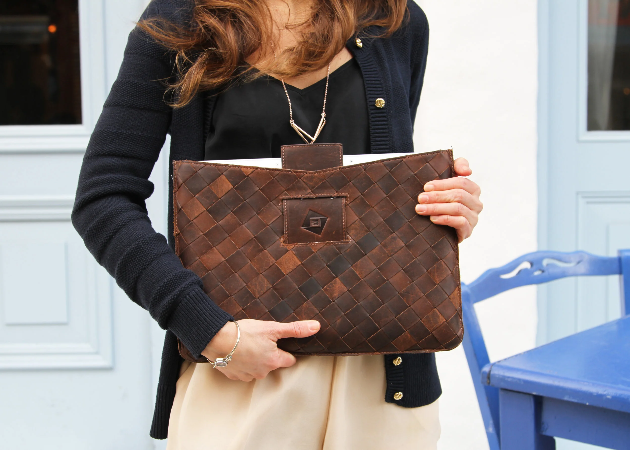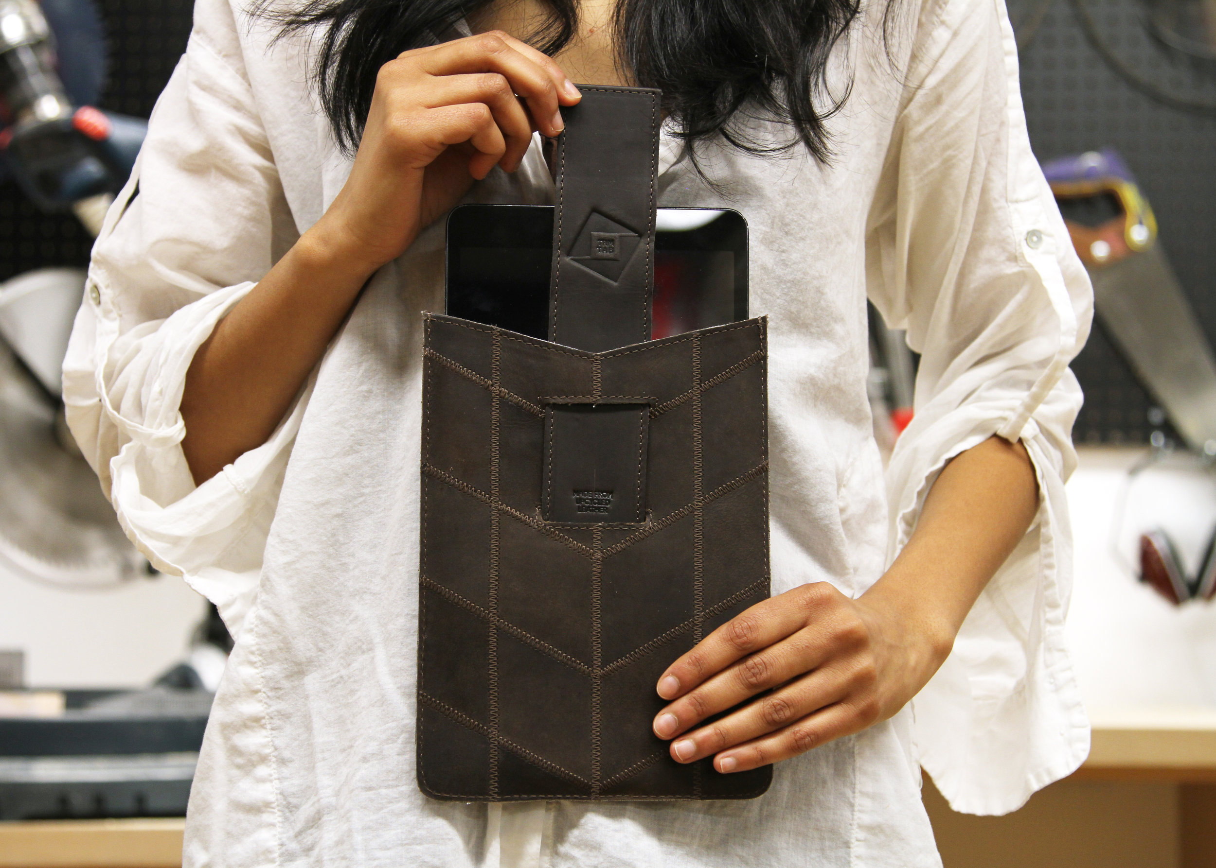 Collaborating with a leather factory in India, Cassandra and Mansi noticed over 4,000 lbs of production waste going into landfills. Instead of overlooking the issue, TRMTAB worked with the factory craftsmen to transform the waste into cleverly designed, refined leather goods for your tech devices. The leather scraps are stitched and woven to efficiently utilize the waste and create a unique blend of color shades, textures and grains giving each product within the collection its own personality.